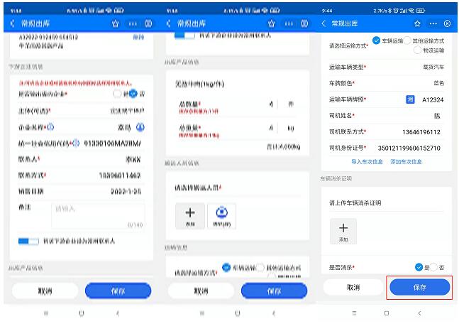 第三步: 出库的产品扫码完成后, 填写下游企业信息、出库产品信息、运输信息(可在主体登记-常用运输信息里进行新增)、选择搬运人员和上传车辆消杀证明;
