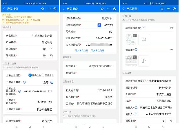 第三步:填写进货信息、上游企业信息、运输信息、到货地址、监管仓信息、证书信息、上传检疫证书、报关单;