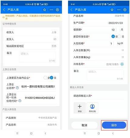 第七步:填写上游企业信息、产品入库信息、选择冷库,搬运人员;注:冷库信息在小程序-主体登记-常用冷库里面新增;搬运人员在小程序-企业人员管理-搬运人员管理中添加;