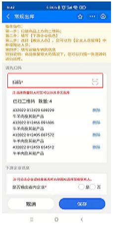 第二步: 点击【扫码】按钮, 扫描产品上方溯源码; 注:溯源码是监管仓出仓后提供 ,出库产品数量较大, 建议分批次进行出库。